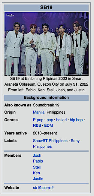 SB19 is a Filipino boy band that debuted in 2018, the pentad—consists of members Pablo, Stell, Ken, Justin, and Josh. They were trained for 4 years by ShowBT Philippines, beginning in 2016. They are the first Filipino and Southeast Asian act nominated for Billboard Music Awards for the Top Social Artist category. They are also the first Southeast Asian act to enter the top 10 Billboard Social 50 weekly and year-end charts. SB19 promotes its music as part of Pinoy pop (P-pop)—a popular sub-genre of Original Pilipino Music.------